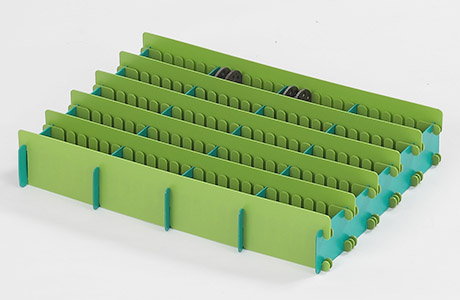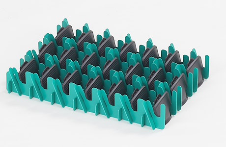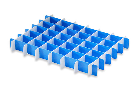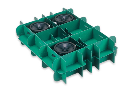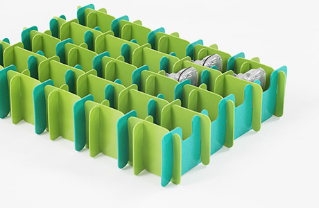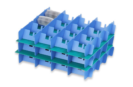 製品が転がらないようにマス目に半円状の受け材を入れた緩衝材(仕切り)
