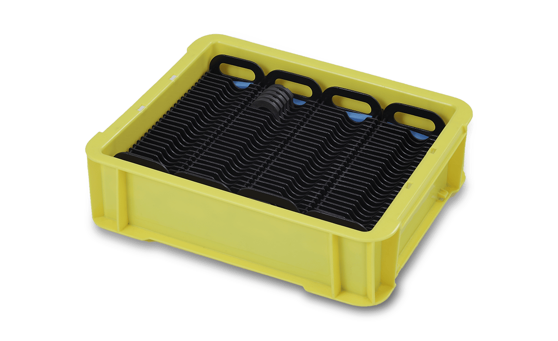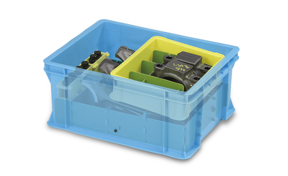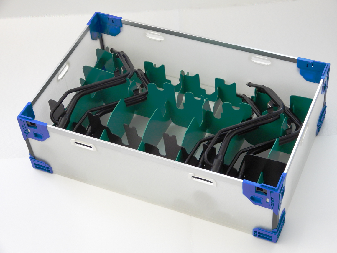 塗装後の製品と付属部品を取り出しやすく、安全に運ぶ通い箱(通函)。